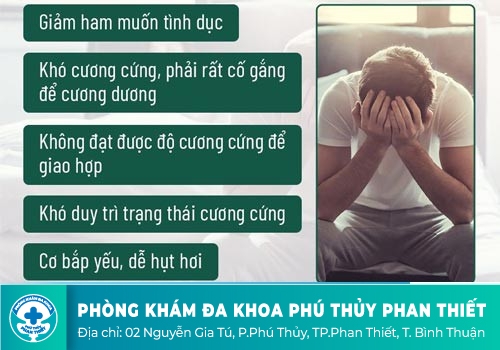 ● Rối loạn cương dương: Dương vật rất khó cương cứng, không đủ độ cương cứng cần thiết để giao hợp, dương vật thường mềm trước khi xuất tinh. |